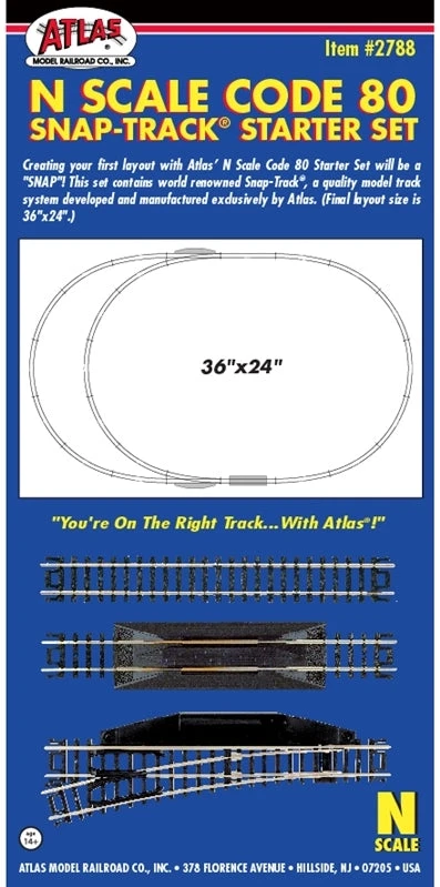 Atlas is proud to announce the new #2788 Code 80 Snap-Track Starter Set. This much-demanded pack makes setting up your first N scale layout a breeze, offering a time-tested beginner configuration of a loop with passing siding. All the necessary pieces are included (sans power pack) to construct the 36” x 24” layout.