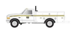 The Atlas N Scale 1990s Ford F-250 – F-350 Pickup/Work Truck Set includes a crew-cab pickup and a utility-body work truck. In 1992 Ford began producing the ninth generation of its popular F-series trucks, which was the last generation to cover the entire model range from the basic half-ton F-150 pickup through the medium duty F-800 commercial trucks. In production through 1998, the F-250 and F-350 pickup trucks featured new aerodynamic styling achieved by rounding off the angles on the hood and front fenders, as well as by enlarging and reshaping the grille to eliminate the square, boxy appearance of previous generations. The redesigned grille area also incorporated new larger, wrap-around headlights and turn signals. Over the production lifetime of these light-duty pickups, a wide variety of cab configurations, detail trims, and power options were available from the factory, and the basic chassis of the 1-ton capable F-350 provided a solid base for work truck conversions. As such, the Ford F-250 and F-350 were well suited for moderate duty use by contractors, emergency services, public utility services, and railroad track and signal maintenance crews. The Atlas Ford F-250 Crew Cab and F-350 Standard Cab Work Trucks faithfully represent two of the common configurations of this popular pickup found in general service roles from the 1990s through the mid-2010s. The F-250 4 door Crew Cab has dual fuel doors, an 8-foot bed, and 4×4 styling, while the F-350 features a dual rear wheel configuration supporting a common aftermarket storage bed design and includes photo-etched extended-vision mirrors and an equipment rack.