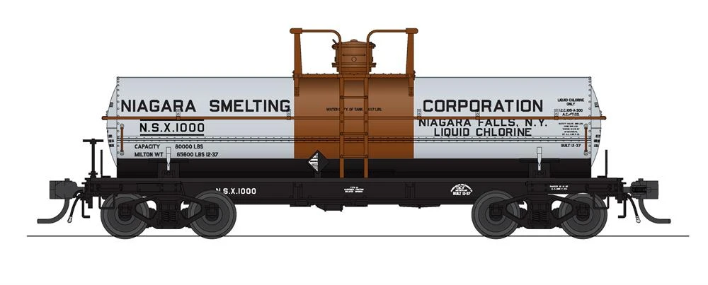 BLI is pleased to deliver the Type 27 tank car which is the slightly elongated younger sibling of the Type 21 tank car. These insulated high pressure cars were used often in the transport of the home heating fuels propane and butane as well as anhydrous ammonia, chlorine, and methyl chloride. They are modeling the 6000 gallon car that often hauled liquid chlorine.