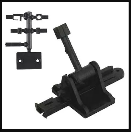 Standard Ground Throws With Selectable End Fittings include a shim to raise the stand to tie level and five different end fittings for connection to most commercially manufactured turnouts: a hook end for Atlas, blade for Roco, hole for PECO, small round pin for Micro Engineering, and round pin for Shinohara and others. They are available with .165″ travel for HO and N in both sprung and rigid configurations.