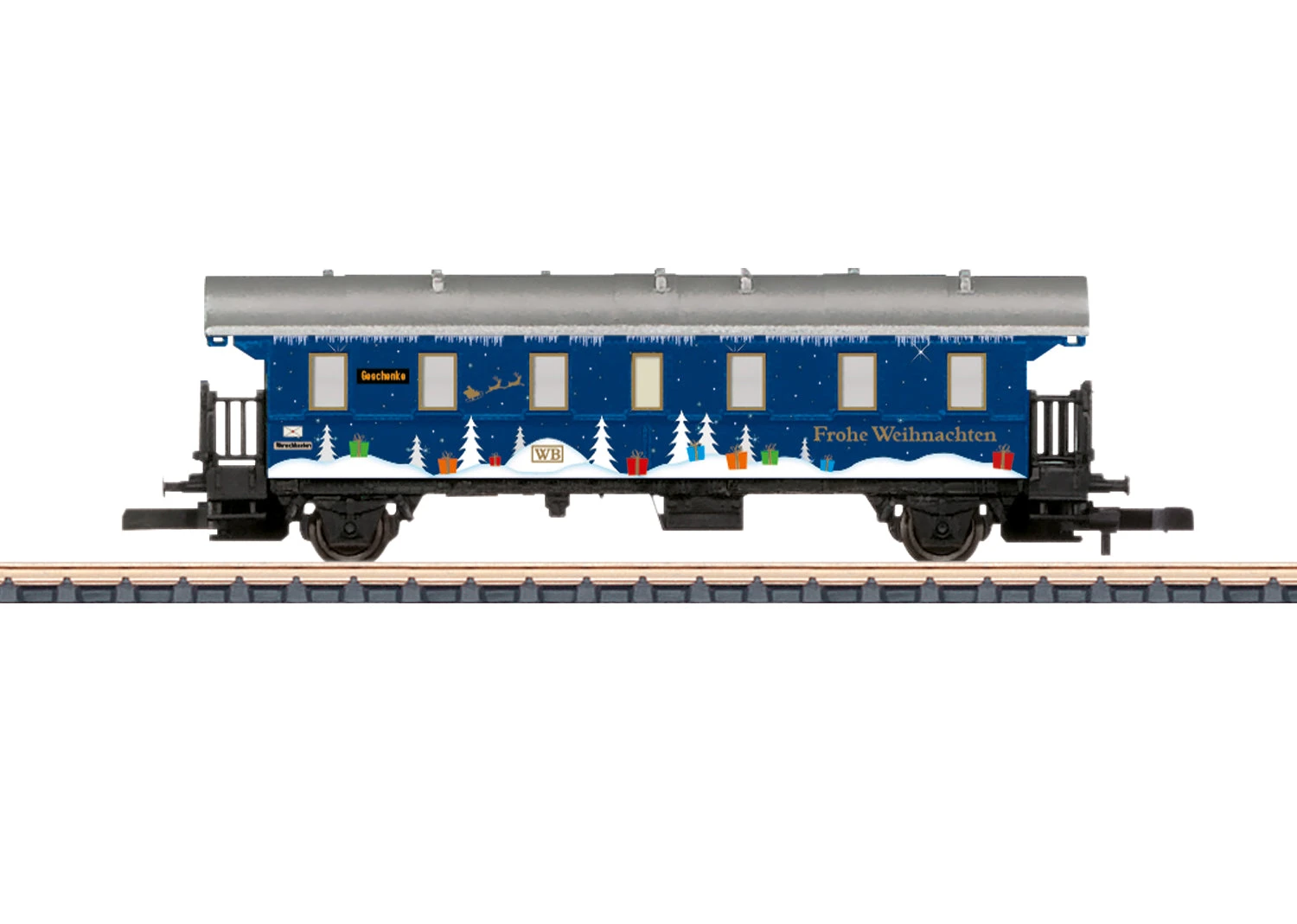 This is a “Thunder Box” passenger car, 3rd class, in a decorative Christmas design. Length over the buffers 63 mm / 2-1/2″.