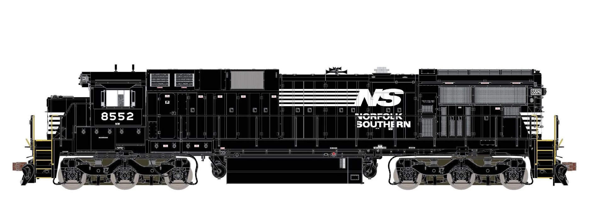 Pleased with their performance, an additional 50 units were delivered in 1985, NS 8564-8613. “Phase II” units, they differed from the previous orders by featuring high-capacity dynamic brakes that resulted in an additional dynamic brake intake and exhaust opening (for a total of three), a handbrake wheel instead of ratchet handbrake, and a larger 4,400 gallon fuel tank replacing the 3,900 gallon tank of previous orders. Also eliminated were the vertical grab iron “ladder strips” on the end of the long hood. Rounding out the NS fleet would be an additional 50 units, built in two batches of 25 units each, NS 8614-8638 and NS 8639-8663, delivered in 1986. These so-called “Phase III” units would feature even more subtle changes; the radiator grills at the end of the long hood featured a slightly different configuration and a flush mounting, the cab doors changed to a square-cornered design, and the units featured a tall 42” snowplow at both ends, in contrast with the smaller 35” plow of previous deliveries.