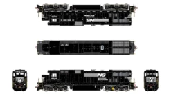 While keeping the clean contours of the long hood and rounded cab roof, two characteristics of the DASH 7 series, these new DASH 8s featured larger, angular radiator “wings” at the rear of the carbody, an angular low short hood, and a boxy dynamic brake and clean air compartment at the front of the long hood, which jutted above the cab roofline. The NS testbed units made an imposing sight in their black paint, and were soon joined by an additional 12 units, NS 8552-8563, built in 1984. While similar to their testbed siblings, these additional units featured slight changes to their carbodies, known as “phases” to railfans and modelers. The testbed units would be dubbed “Phase Ia”, while NS 8552-8563, with slight production changes to their radiator grills and dynamic brake compartment would be known as “Phase Ib” units.