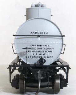 ANPX “Anchor Petroleum Company, Tulsa OKLA. 1948+” is available for US modelers that are looking to bolster their fleet of “refined product” tank cars. These insulated tank cars were likely used to haul refined oil products such as gasoline. This car is stenciled like the prototype photo on our website, representing the car as it appeared in 1948. We offer these neat tank cars in gray paint and black stenciling on the tank body. The cars are offered with six road numbers, and because each real tank car was formed by hand and had individual gallon notations stenciled on each end of the car, all six of our models have the correct gallons stenciled on each end.