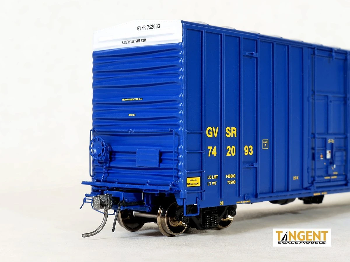 GVSR “B-70-43 Repaint 1996+” illustrates that oh-so-90s look of the “Golden West Service” paint scheme. Starting in 1996, SP sold some groups of the SP and SSW B-70-42 cars to Greenbrier Leasing, who then refurbished the cars and leased them back to the SP through the GVSR. Painted dark blue, these cars went right back to work on the SP for many years. This model features lots of fine small door data and labels, carefully reproduced to add even more pop to those beautiful double plug doors. The separate door tracks and “3rd Arm” details really stand out! Tangent also applied “replacement” style tack boards on the sides and ends to duplicate the prototype after refurbishing. The Tangent GVSR model is equipped with accurate black 70-ton “Birdsboro foundry” Barber S-2 trucks that have rotating “Timken” roller bearing caps.