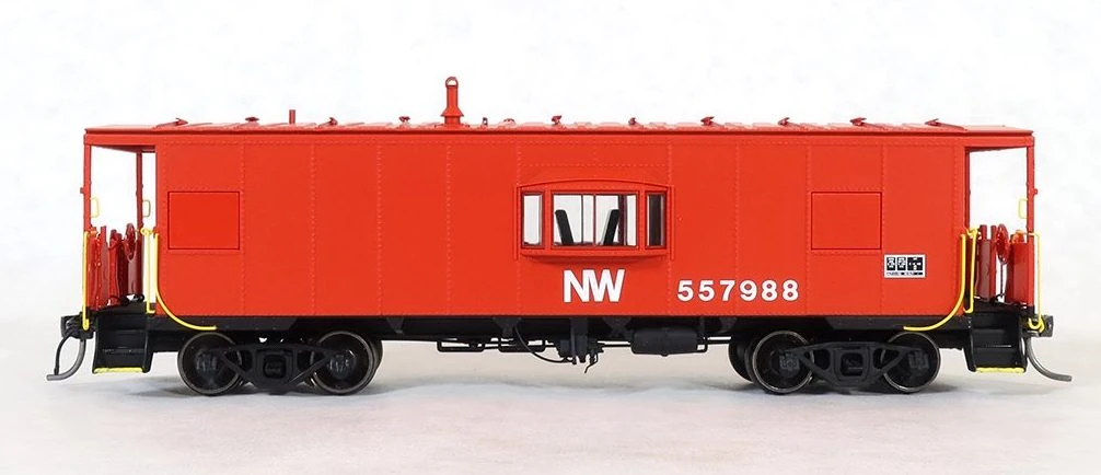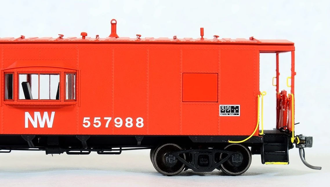 Norfolk & Western (NW) “Red Repaint 1982+” is the final paint scheme to be applied to the ITC St. Louis Car Co. caboose fleet. The NW took over operations of the ITC in 1981 and refurbished several of the ITC cabooses in 1982 for local and transfer service. It is amazing what a fresh coat of caboose red and white NW graphics can do! The prototype side windows have been plated over, and the rooftop walkways and end ladders are long gone. This model features these same modernizations, and make sure that you check out the intricate roof walkway metal brackets. You can see the individual walkway bolt holes on top of each one! These are the finest walkway brackets available in HO Scale. The ends of the caboose feature era-appropriate flashing FRA red lights. The underframe has also lost the equipment boxes and toilet pipe. The interior of the caboose is lit, which can still be seen through those big bay windows. Tangent kept getting asked from the NW guys about this scheme, so now’s your chance to have a little bit of the 1980s in your caboose fleet.