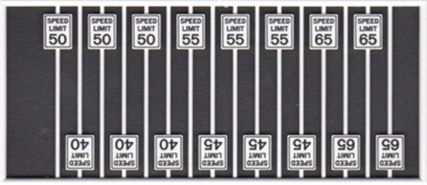 These are speed limit signs, 3 each of 40, 45, 50 & 55 MPH. 4 Each of 65 MPH. They are molded in off white styrene with black printing.