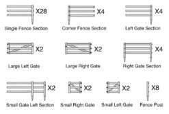 - Includes fence sections plus parts for two large double gates, two small/single gates, four individual fence posts and four corner posts