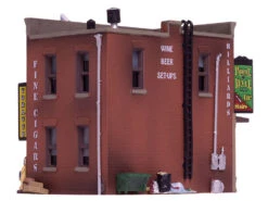 The Corner Emporium is an old-time three-in-one store. There is a barber shop in the front with a tobacco shop in the rear, with billiards upstairs. There are three cycles and an old Cigar Store Native American statue outside the door. This building has signs, posters, a flag, awnings and an old barber pole. The Corner Emporium has one LED light to show off the printed interior. See photos for footprint.