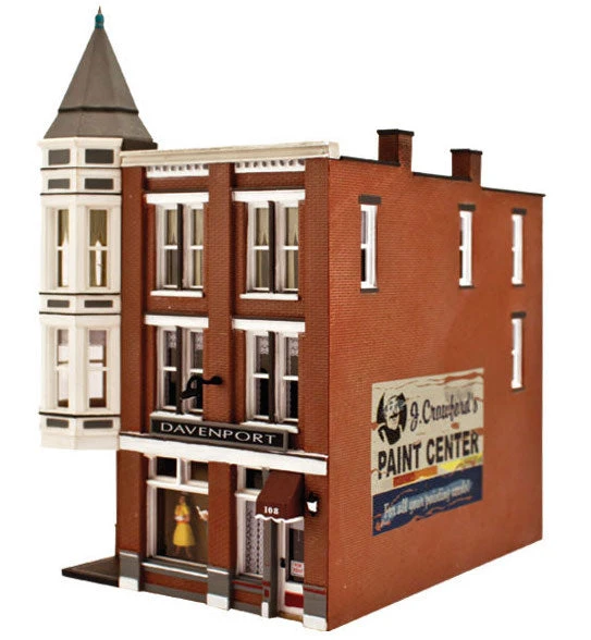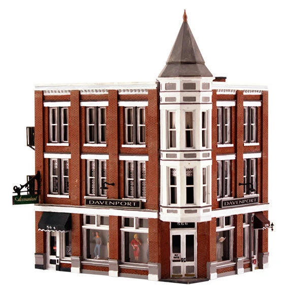 The classic Victorian architecture of Davenport Department Store, with its two-story corner turret, will dress up any downtown layout scene. Large first-floor picture windows feature mannequins and second and third floor windows feature a variety of window treatments. Building details include full roof detail, wrought-iron balconies and fire escape, signage, awnings, and light fixtures. See photos for footprint.