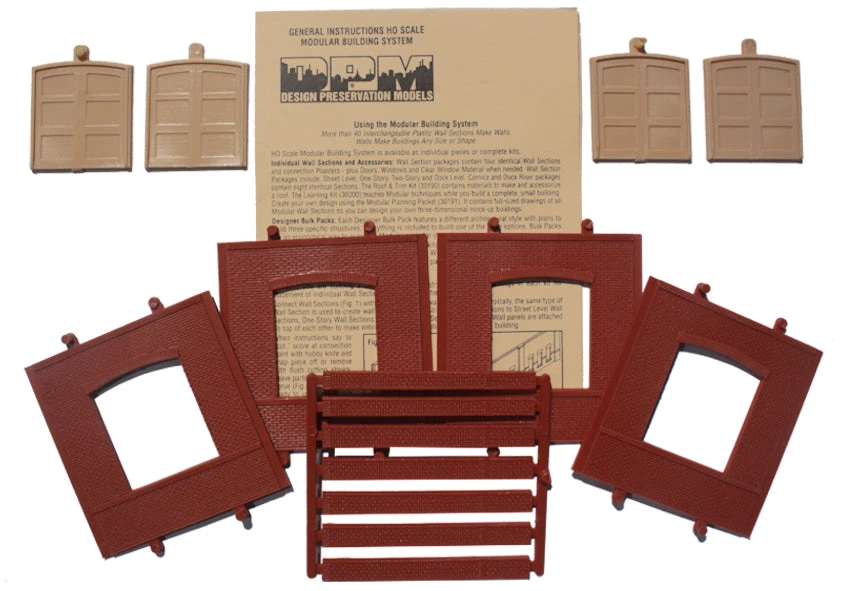 Interchangeable plastic wall sections make it possible to create buildings of any size, shape and height. Build a variety of styles – whatever you want or need. Packages include four identical wall sections with pilasters, plus doors, windows and clear window material where needed. All sections are the same width (2-3/4″ 7cm) and color. Cornice packages include eight sections of Cornice with Cornice pilasters, Dock Riser Wall packages include eight Dock Riser Wall sections with dock pilasters. Powerhouse Window packages include two two-story windows and four walls.