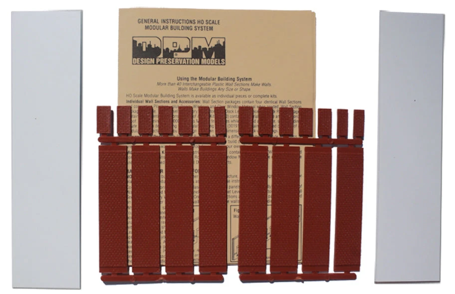 Interchangeable plastic wall sections make it possible to create buildings of any size, shape and height. Build a variety of styles – whatever you want or need. Packages include four identical wall sections with pilasters, plus doors, windows and clear window material where needed. All sections are the same width (2-3/4″ 7cm) and color. Cornice packages include eight sections of Cornice with Cornice pilasters, Dock Riser Wall packages include eight Dock Riser Wall sections with dock pilasters. Powerhouse Window packages include two two-story windows and four walls.