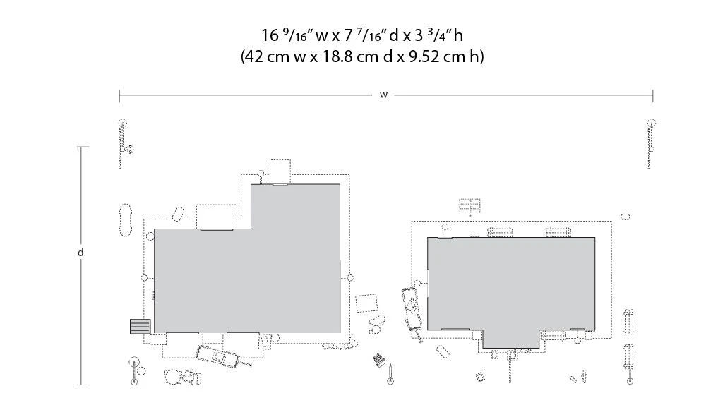 Two building freight and passenger depot with many details including benches, freight scale, hydrocal platforms, postal box, power meter, pallet, schedule board, soda machine, light post, baggage cart, dry transfer decals, and more! See photos for footprint. Vehicles, figures and landscape sold separately.