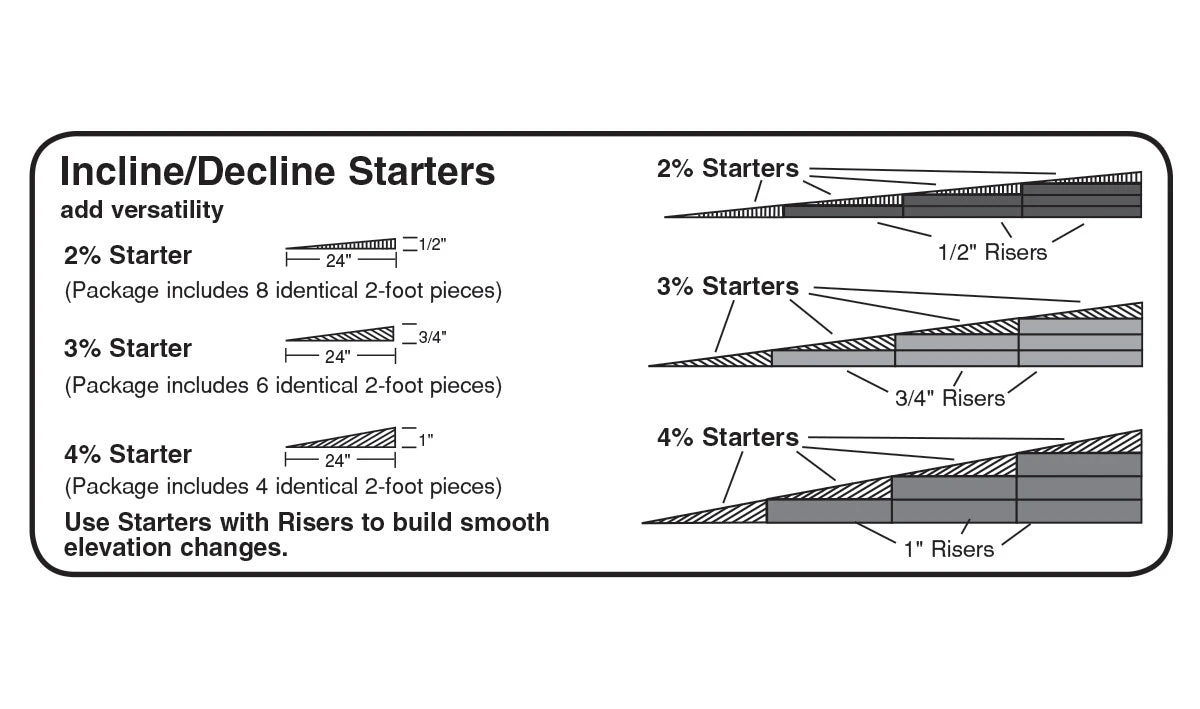 Incline Starters are wedges of high-density foam used to start your track on an incline or decline. Each piece in a package elevates/lowers the track to/from a designated number of inches within a 24″ stretch, allowing for a smooth transition from one height to another.