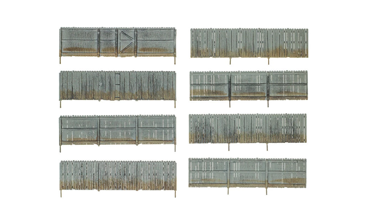 Add character to any scene with hand-painted and authentically weathered N scale Privacy Fence. Easily assemble the Fence on your layout by aligning the modular pieces. Features gates, detailed hinges and planter pins for simple installation. Put Privacy Fence around businesses and backyards of homes.
